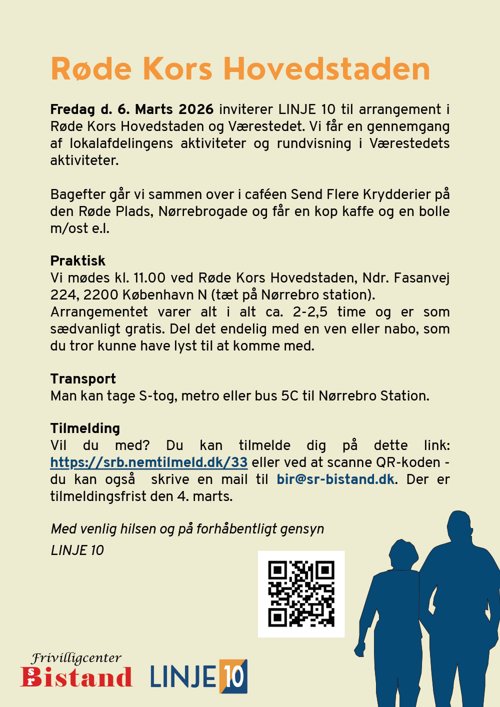 Fredag den 6. marts 2026 inviterer LINJE 10 til arrangement i Røde Kors Hovedstaden og Værestedet. Vi får en gennemgang af lokalafdelingens aktiviteter og rundvisning i Værestedets aktiviteter. Bagefter går vi sammen over i caféen Send Flere Krydderier på den Røde Plads, Nørrebrogade og får en kop kaffe og en bolle m/ost e.l. Praktisk Vi mødes kl. 11.00 ved Røde Kors Hovedstaden, Ndr. Fasanvej 224, 2200 København N (tæt på Nørrebro station). Arrangementet varer alt i alt ca. 2-2,5 time og er som sædvanligt gratis. Del det endelig med en ven eller nabo, som du tror kunne have lyst til at komme med.